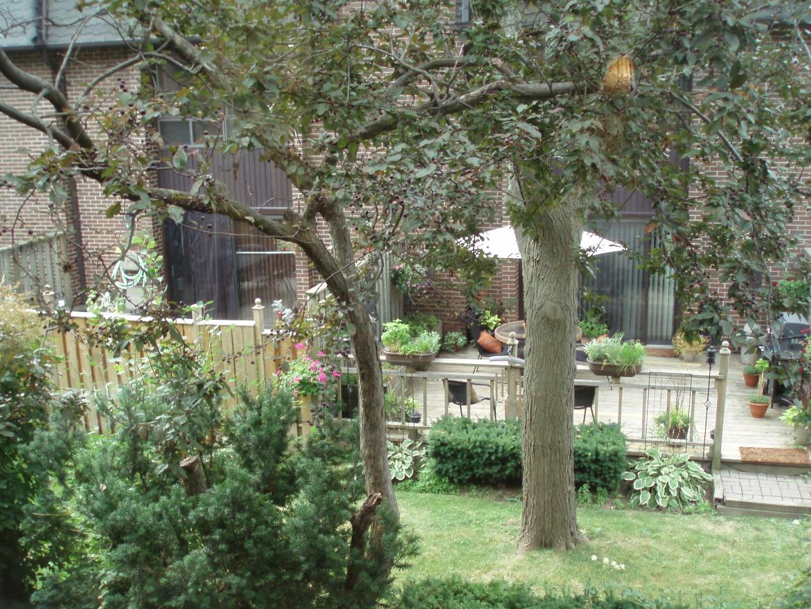 CLASSIC & TRADITIONAL, SUN-FILLED END UNIT! EXPANSIVE TREETOP VIEWS & CHARM OF “YESTERYEAR! SPACIOUS PRINCIPAL RMS FEATURING: 2 FLR-TO-CEILING HEARTHS(ONE WOOD BURNING, ONE NATURAL GAS), INTERIOR BRICK WALLS, WROUGHT IRON BANNISTERS & FAMILY ROOM WALK-OUT TO BRICK-WALLED GARDEN-LEVEL TERRACE! PRIVATE GARAGE ENTRY ACCESS! THIS TWO-BDRM LAYOUT CAN BE CONVERTED BACK TO THREE BDRMS!